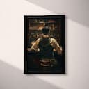 A vintage oil painting, man at a bar with a glass of whisky, back view.