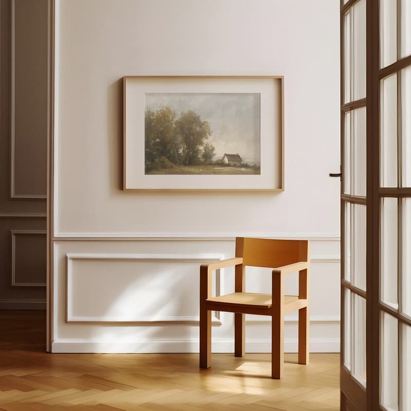 A french country oil painting, country farmhouse and trees under a gray sky, distant view.