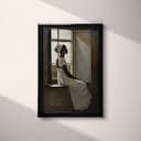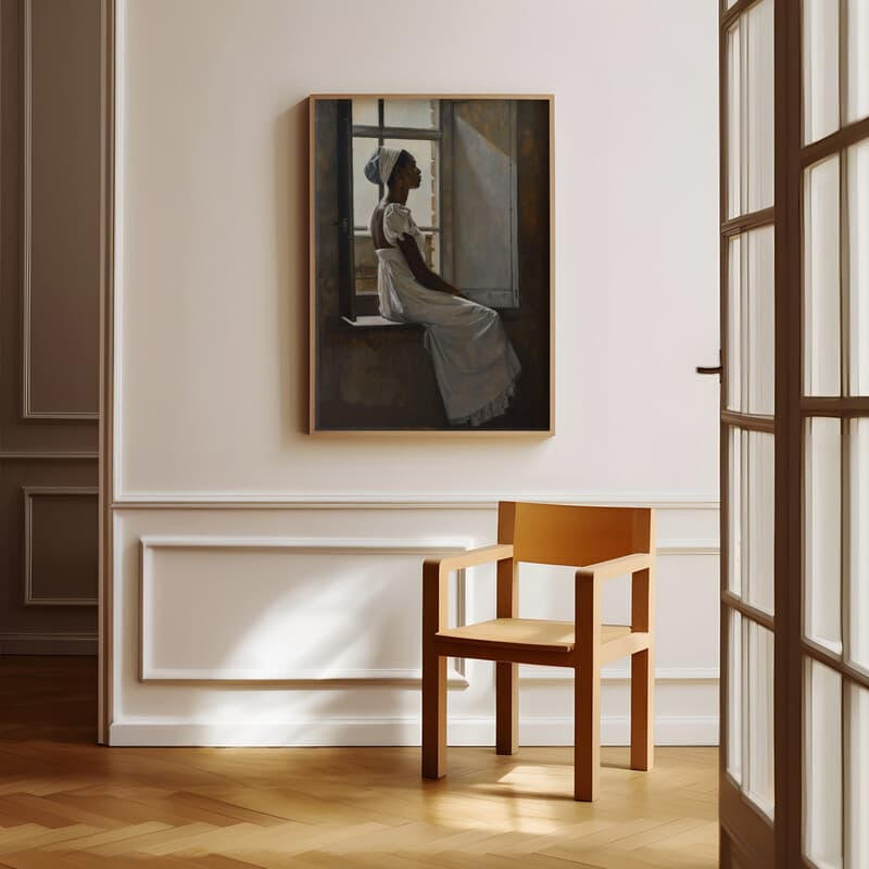 An afrofuturism oil painting, a woman in a white dress sitting at a window sill.