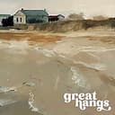 An impressionist oil painting, beach and ocean, a lake house in the distance, gray sky.