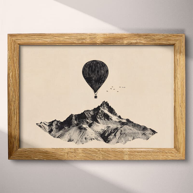 Hot Air Balloon Art | Landscape Wall Art | Landscapes Print | White, Black and Brown Decor | Minimal Wall Decor | Living Room Digital Download | Housewarming Art | Graphite Sketch