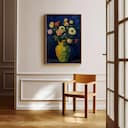 An impressionist oil painting, flowers in a yellow vase with green pattern, dark blue background.