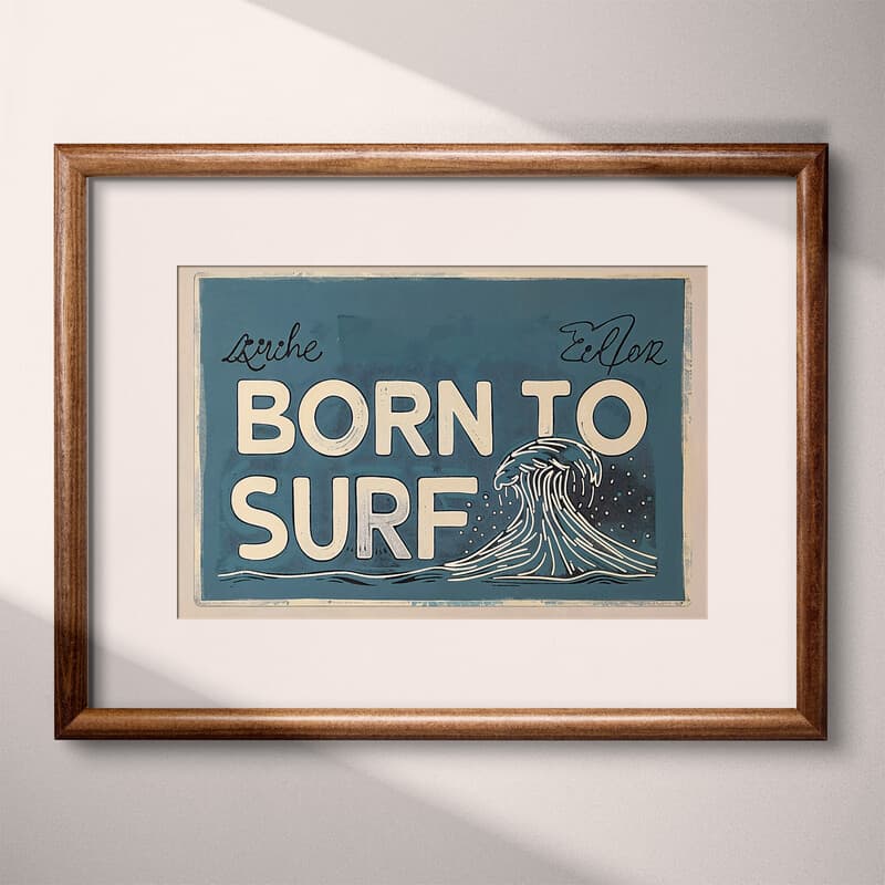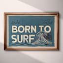 A vintage linocut print, the words "BORN TO SURF" with a wave.